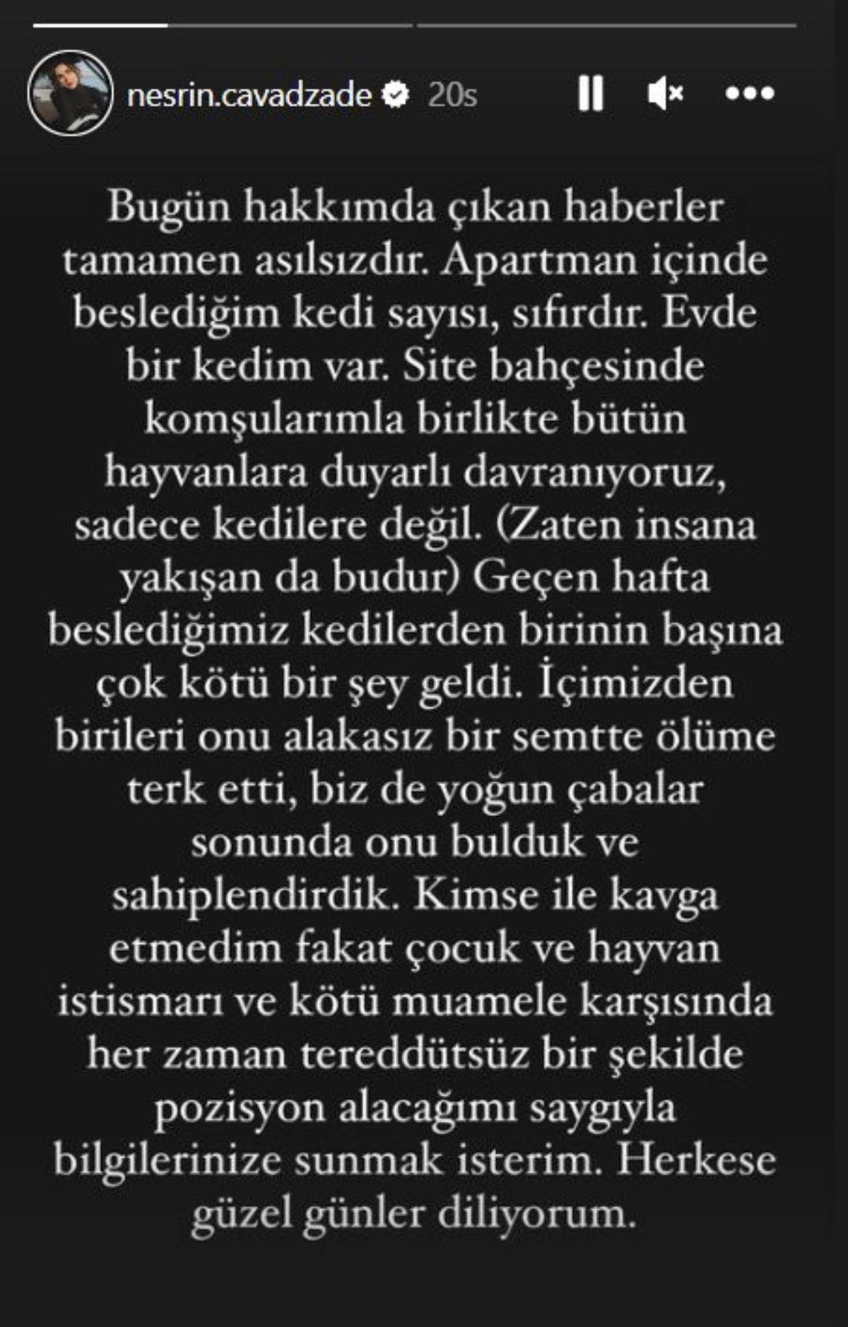 Altı ay önce 16 yıllık kedisi Çiko’yu ve daha sonra Api’yi kaybeden oyuncu Nesrin Cavadzade’nin 15 kediyi apartmanın içinde besleyince komşularıyla sözlü tartışma yaşadığı iddia edildi.