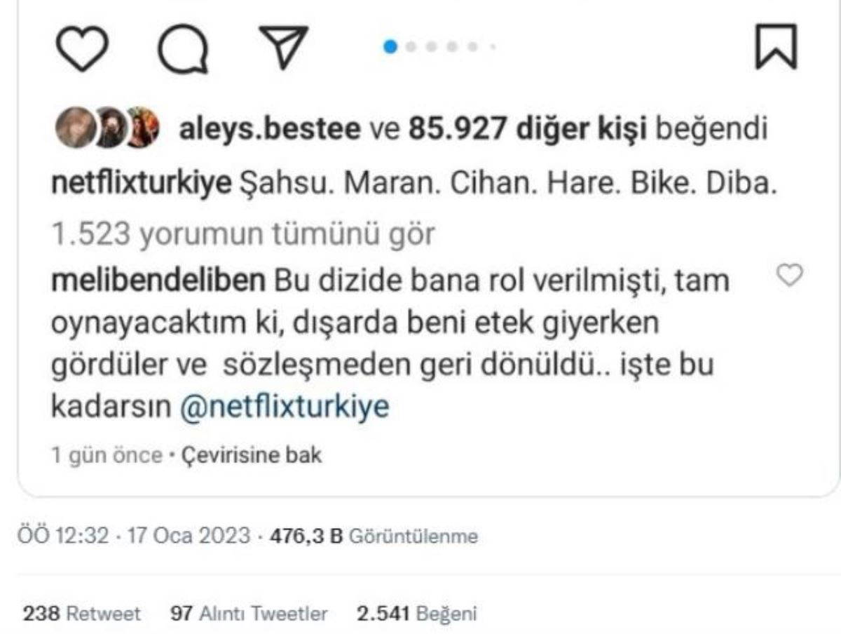 "Bu yeni çıkacak Netflix yapımı Şahmaran dizisinde, bana rol verilmişti. Ama beni dışarda etekle gördüklerinden? (Şaka gibi) rolü geri aldılar. Sözleşmeden dönüldü. İşte ülkedeki sanat camiası. İşte size yeni Netflix işi. Hak yiyenin hakkı olmasın dilerim."