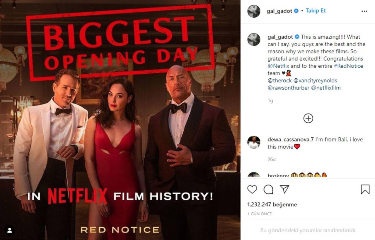 Gal Gadot ise en iyi açılış filmi olduğunu vurgulayan görseli paylaşarak “Ne diyebilirim ki, sizler en iyisisiniz ve bu filmleri yapmamızın sebebisiniz. Çok minnettar ve heyecanlıyım! Netflix ve tüm Red Notice ekibine tebrikler!” ifadelerini kullandı.