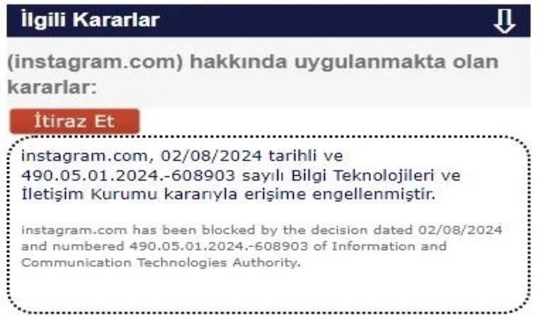 BTK tarafından yapılan açıklamada ise şu ifadelere yer verildi: Instagram.com, 02/08/2024 tarihli ve 490.05.01.2024.-608903 sayılı Bilgi Teknolojileri ve İletişim Kurumu kararıyla erişme engellenmiştir.