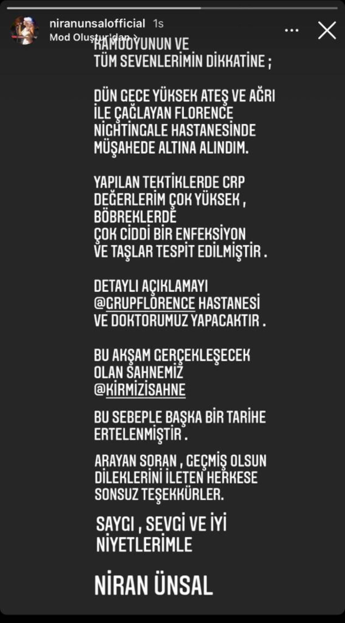 Sosyal medya hesabından sağlığı ile ilgili açıklamalarda bulunan şarkıcı Niran Ünsal, "Dün gece ağır ateş ve ağrılar nedeni ile Florance Nightingale hastanesinde müşahade altına alındım. Yapılan tetkiklerde ‘cpr’ değerlerim yüksek ve sol böbrekte taşlar tespit edilmiştir.Bu akşam yapacağım sahne çalışmam bu nedenle ileri bir tarihe ertelenmiştir, misafirlerimizden şahsım adına çok özür dilerim” ifadelerini kullandı.