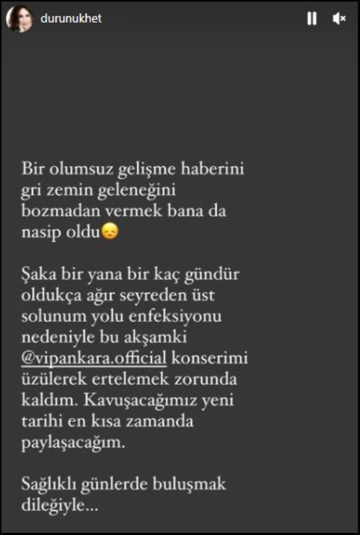 ŞarkıcıInstagram hesabından yaptığı paylaşımda “Bir olumsuz gelişme haberini gri zemin geleneğini bozmadan vermek bana da nasip oldu. Şaka bir yana birkaç gündür ağır seyreden üst solunum yolu enfeksiyonu nedeniyle bu akşamki konserimi üzülerek iptal etmek zorunda kaldım. Kavuşacağımız yeni tarihi en kısa zamanda paylaşacağım. Sağlıklı günlerde buluşmak dileğiyle” ifadelerini kullandı.