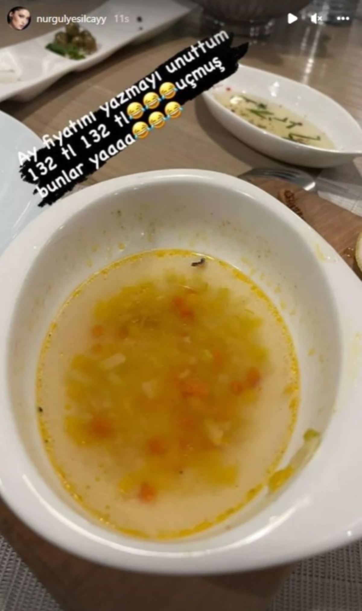 Çorbanın fotoğrafını paylaşan Yeşilçay, “Ay öyle bir yerdeyiz ki of çok iyi! Çorba ölmeden önce! Ay fiyatını yazmayı unuttum 132 lira 132 lira. Uçmuş bunlar yaaaa” ifadelerini kullandı.