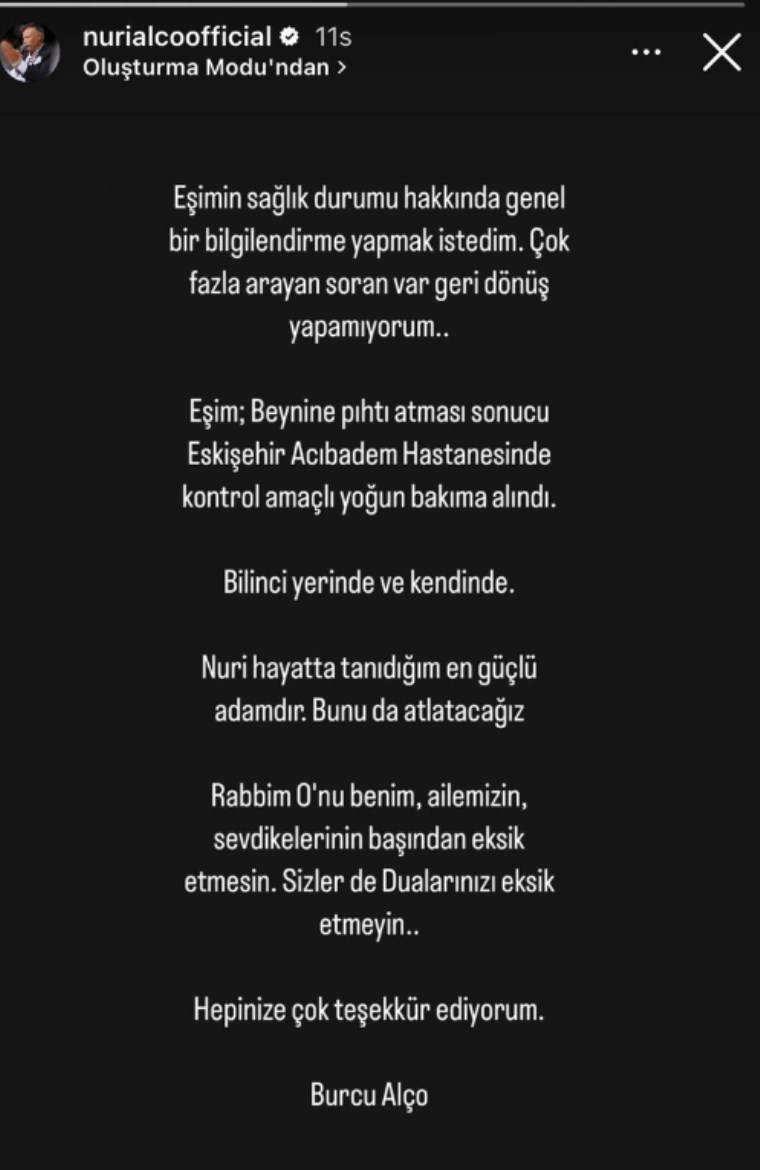 Nuri Alço'nun eşi Burcu Alço da, usta oyuncunun sağlık durumuna dair sosyal medyadan bir açıklamada bulundu.
