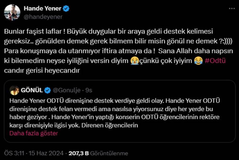 "Gönül" isimli bir sosyal medya kullanıcısı "Hande Yener ODTÜ direnişine destek verdiye geldi olay. Hande Yener ODTÜ direnişine destek falan vermedi ama nasıl da yiyorsunuz diye her yerde bu haber geziyor. Hande Yener'in yaptığı konserin ODTÜ öğrencilerinin rektöre karşı direnişiyle ilgisi yok. Direnen öğrencilerin programını beğenmeyen başka bir grup öğrencinin ODTÜ dışında yaptığı organizasyon. Muhtemelen danışıklı dövüş. Hande Yener oraya ücretsiz de gelmemiştir. O kadar masrafı kendi cebinden karşılamamıştır. O parayı kim ödedi bulursanız gerisi gelir. İyi yapmış güzel yapmış aferin, ama konunun ODTÜ direnişi ile ilgisi yok. Bunu ODTÜ mezunları derneği yöneticileri bizzat söylüyor ama onların Hande gibi ağı yok" dedi.
