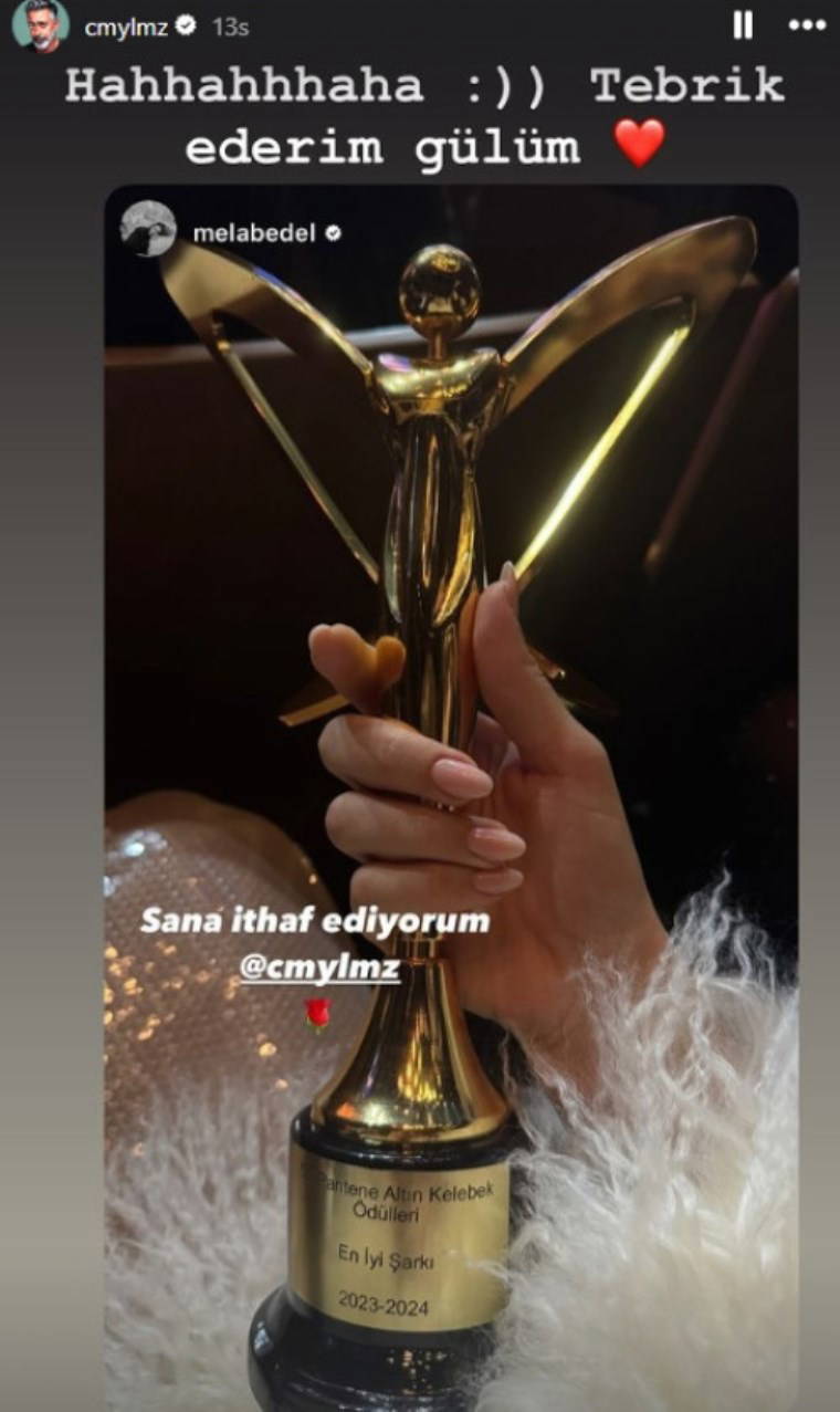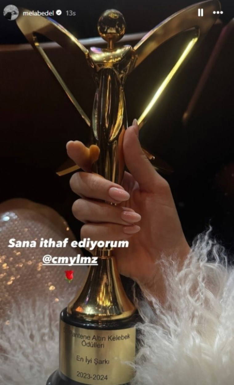 Ödül sonrası sosyal medya paylaşımıyla dikkat çeken Mela Bedel, aldığı Altın Kelebek’i Cem Yılmaz’a ithaf ettiğini duyurdu.