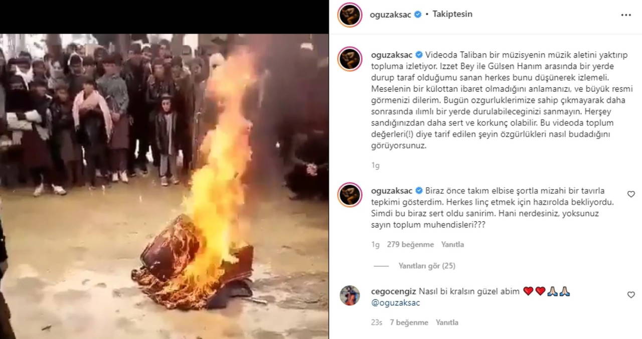Halk müziği sanatçısı Oğuz Aksaç, Afganistan'da dinci Taliban güçlerinin meydanlarda müzik aletlerini yakmaya başladığı anlara dair görüntülerle ilgili Türkiye'ye yönelik bir sosyal medya paylaşımı yaptı.