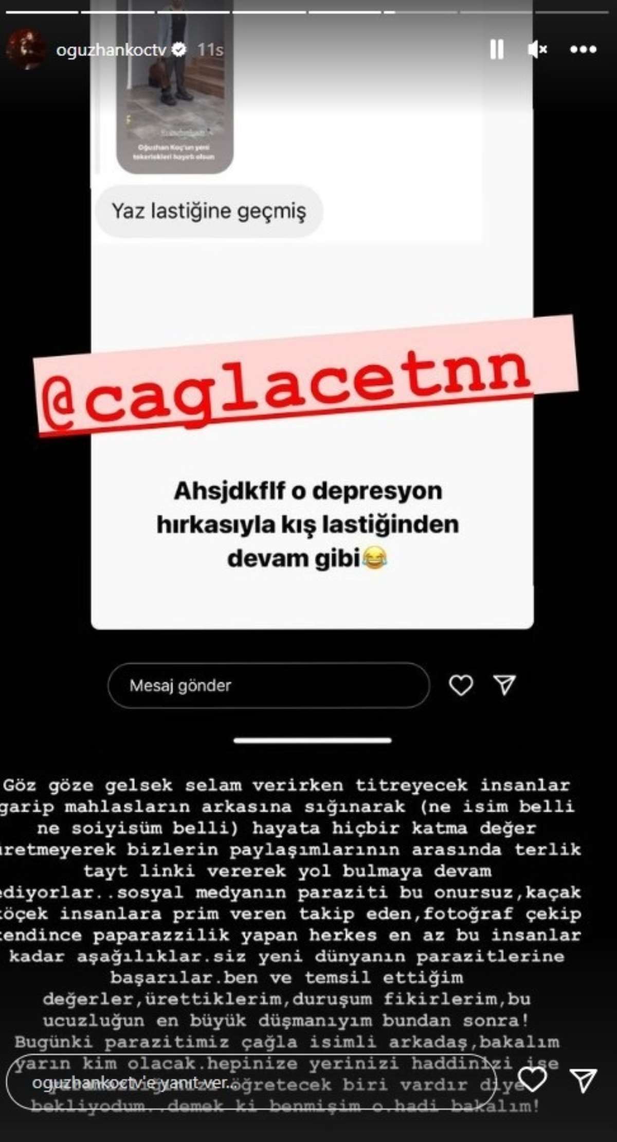 Daha sonra Gossip Pasta'nın hesabını paylaşan Oğuzhan Koç, "Vatandaşları, tanınmış isimlerin üzerine salarak her yerden fotoğraf, video alıp sayfasında paylaşarak para kazanmaya çalışan Çağla ve Çağla gibi bedavacı tüm hesapları ifşa ediyorum bundan sonra. Hakikaten simit sat onurlu yaşa. Alın siz meçhul şarkıcı" dedi.