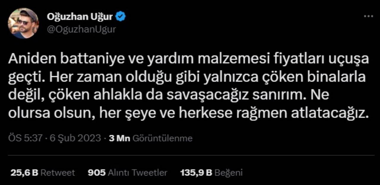 “Aniden battaniye ve yardım malzemesi fiyatları uçuşa geçti. Her zaman olduğu gibi yalnızca çöken binalarla değil, çöken ahlakla da savaşacağız sanırım. Ne olursa olsun, her şeye ve herkese rağmen atlatacağız.”