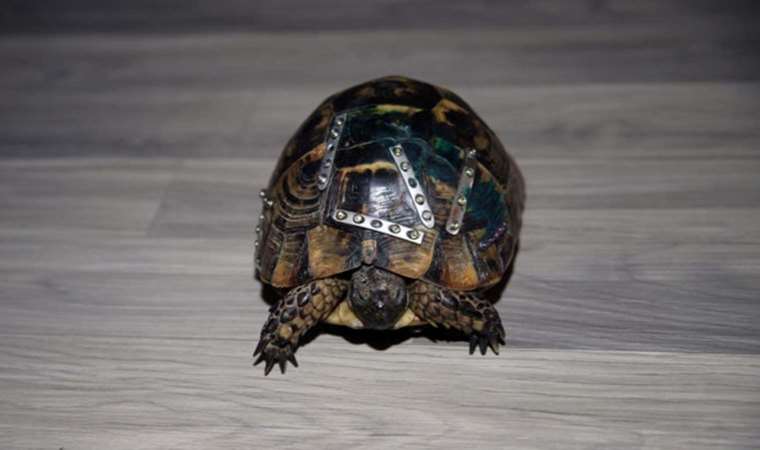 Aydın'ın Efeler ilçesinde bir hayvanseverin yolda ölmek üzereyken bulduğu kaplumbağa veteriner kliniğindeki müdahaleyle hayata döndürüldü, hayvanın kırılan kabuğu metal plaklar kullanılarak bir araya getirildi.