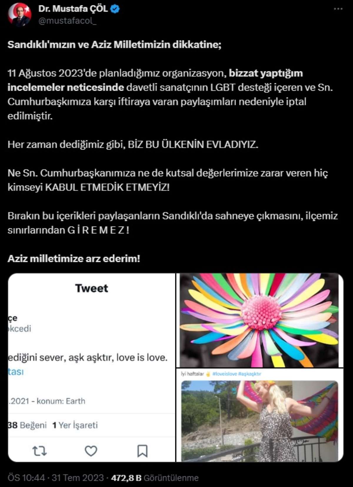 "Sandıklı'mızın ve Aziz Milletimizin dikkatine; 11 Ağustos 2023'de planladığımız organizasyon, bizzat yaptığım incelemeler neticesinde davetli sanatçının LGBT desteği içeren ve Sn. Cumhurbaşkımıza karşı iftiraya varan paylaşımları nedeniyle iptal edilmiştir.Her zaman dediğimiz gibi, biz bu ülkenin evladıyız. Ne Sn. Cumhurbaşkanımıza ne de kutsal değerlerimize zarar veren hiç kimseyi kabul etmedik, etmeyiz! Bırakın bu içerikleri paylaşanların Sandıklı'da sahneye çıkmasını, ilçemiz sınırlarından giremez! Aziz milletimize arz ederim!"