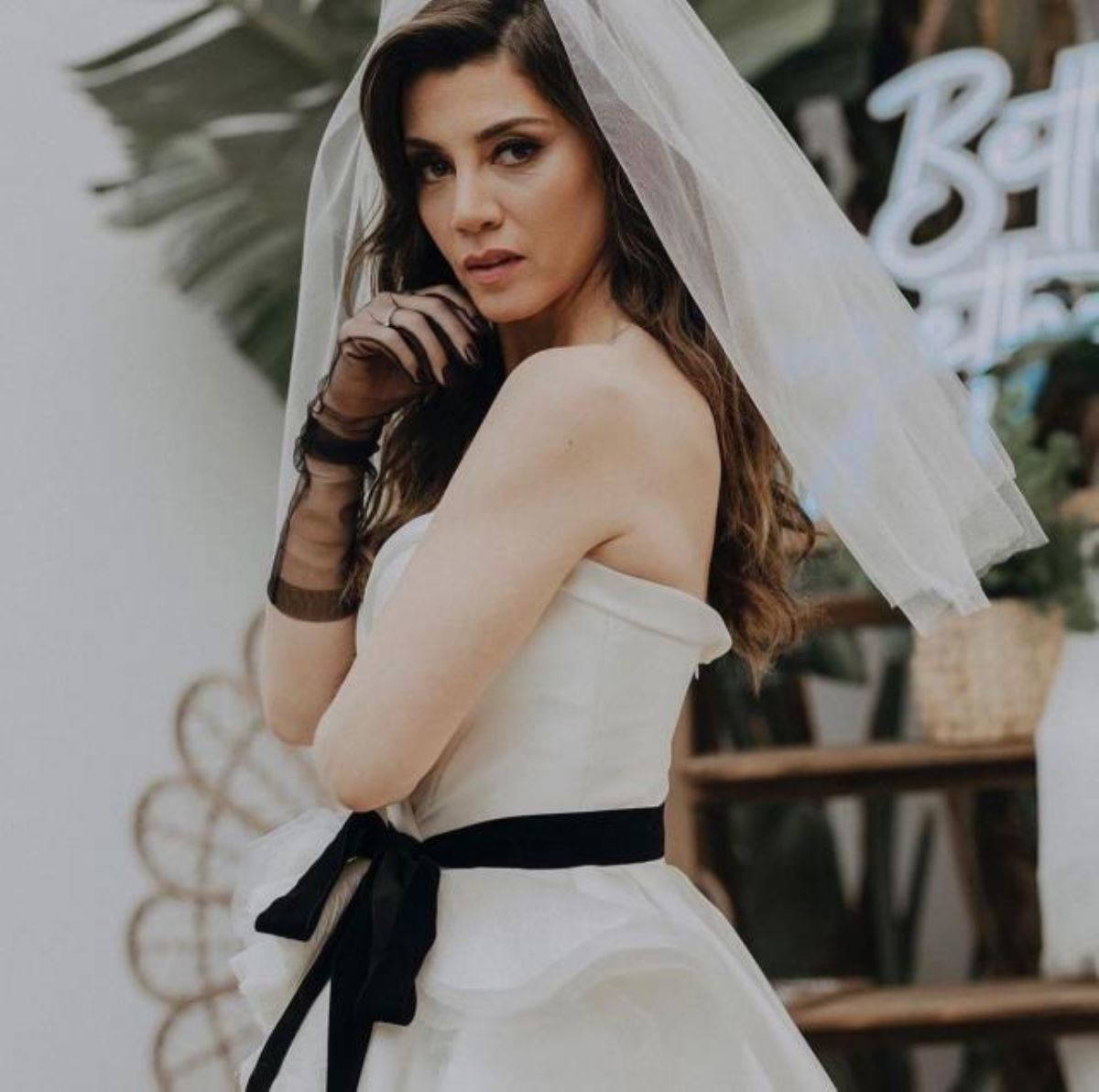 Bahadır'ın kat kat olan gelinliğindeki siyah kuşak ve siyah eldiven ayrıntısı dikkat çekti.