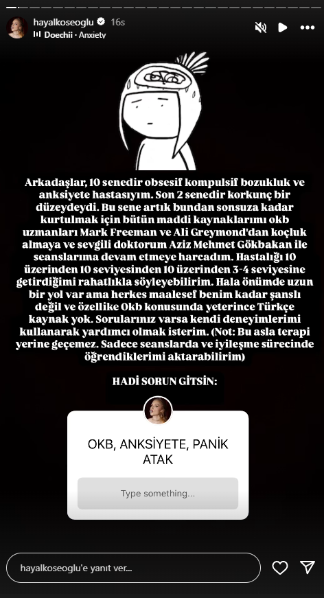 Instagram hesabı üzerinden takipçilerine seslenen Hayal Köseoğlu, Obsesif Kompulsif Bozukluk (OKB) ve Anksiyete ile 10 yıldır mücadele ettiğini açıkladı. Son iki yılda hastalığın şiddetinin ciddi boyutlara ulaştığını belirten Köseoğlu, tedavi sürecine dair çarpıcı bilgiler verdi.