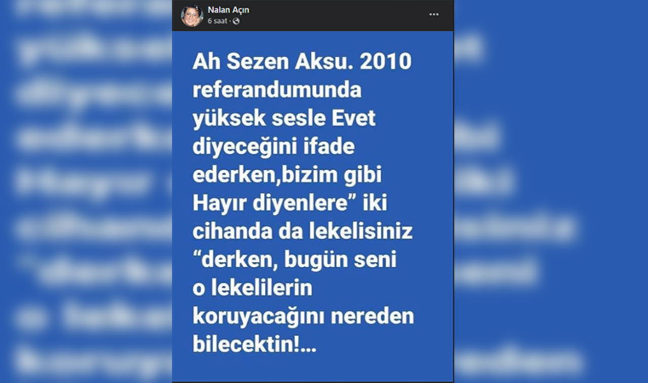 Açın Facebook hesabından yaptığı paylaşımda şunları yazdı: ''Ah Sezen Aksu. 2010 referandumunda yüksek sesle ‘Evet’ diyeceğini ifade ederken, bizim gibi ‘Hayır’ diyenlere, ‘İki cihanda da lekelisiniz’ derken bugün seni o lekelilerin koruyacağını nereden bilecektin".