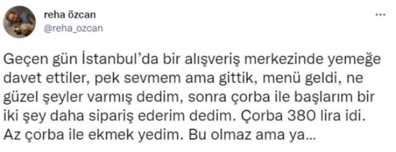 Twitter hesabından artan fiyatlara sitem eden Reha Özcan, "Geçen gün İstanbul'da bir alışveriş merkezinde yemeğe davet ettiler, pek sevmem ama gittik. Menü geldi, 'Ne güzel şeyler varmış' dedim. Sonra 'çorba ile başlarım bir iki şey daha sipariş ederim' dedim. Çorba 380 TL'ydi. Az çorba ile ekmek yedim. Bu olmaz ama ya" dedi.