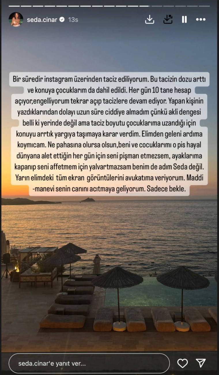 Boşanmanın ardından sosyal medya üzerinden taciz edildiğini söyleyen Seda Çınar, farklı hesaplardan yapılan paylaşımların çocuklarına kadar ulaştığını ve bu durumu artık yargıya taşıyacağını ifade etti.