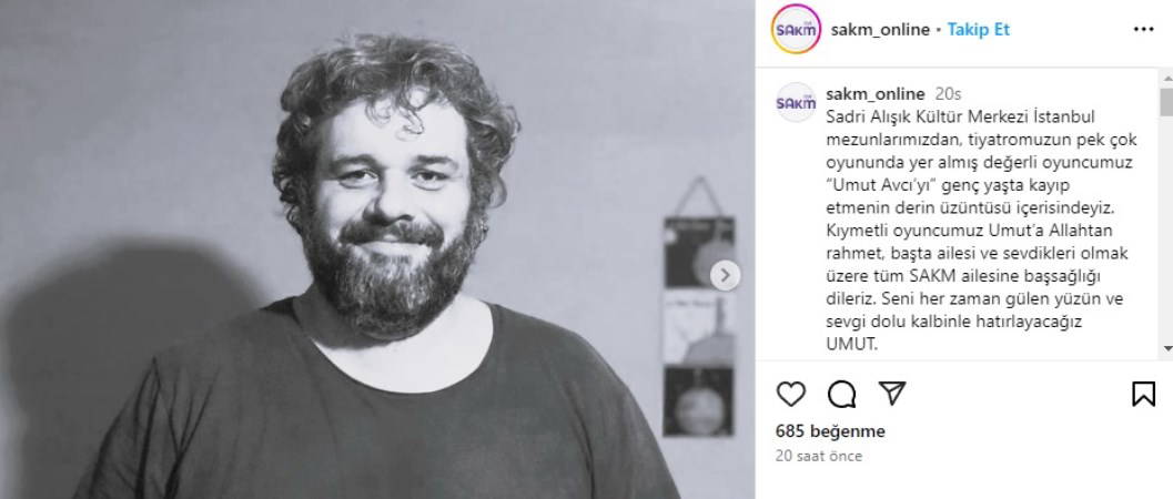 "İstanbul mezunlarımızdan, tiyatromuzun pek çok oyununda yer almış değerli oyuncumuz 'Umut Avcı’yı genç yaşta kayıp etmenin derin üzüntüsü içerisindeyiz. Kıymetli oyuncumuz Umut’a Allahtan rahmet, başta ailesi ve sevdikleri olmak üzere tüm SAKM ailesine başsağlığı dileriz. Seni her zaman gülen yüzün ve sevgi dolu kalbinle hatırlayacağız UMUT."