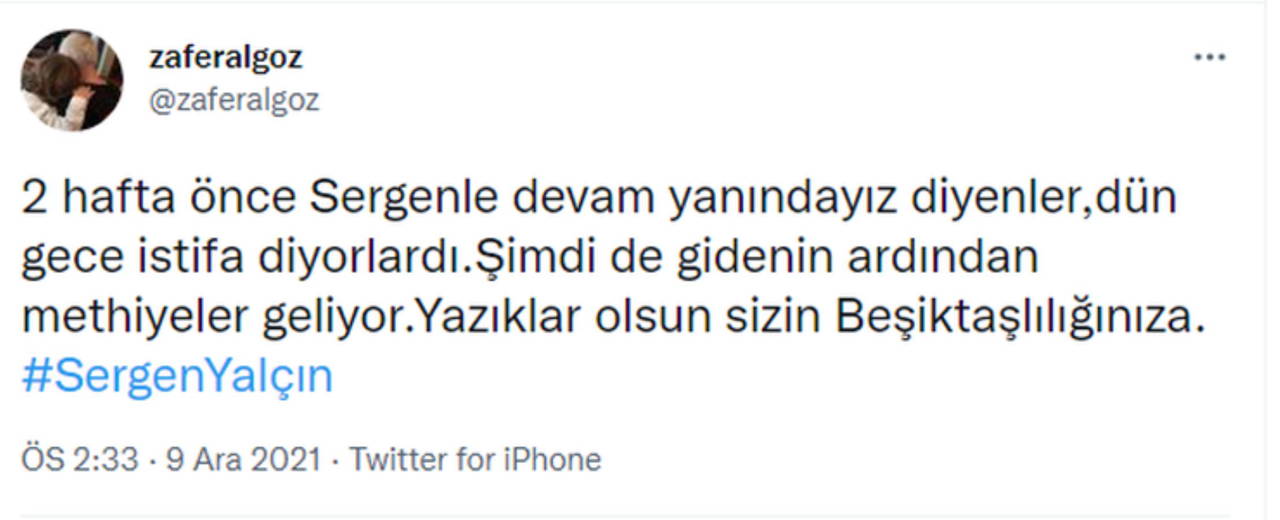 Algöz'ün paylaşımı Beşiktaş taraftarından destek aldı. Sergen Yalçın'ın görevinden ayrılması sonrası Beşiktaşlı futbolcular, deneyimli teknik adama sosyal medya hesaplarından yaptıkları paylaşımlarla veda etti.