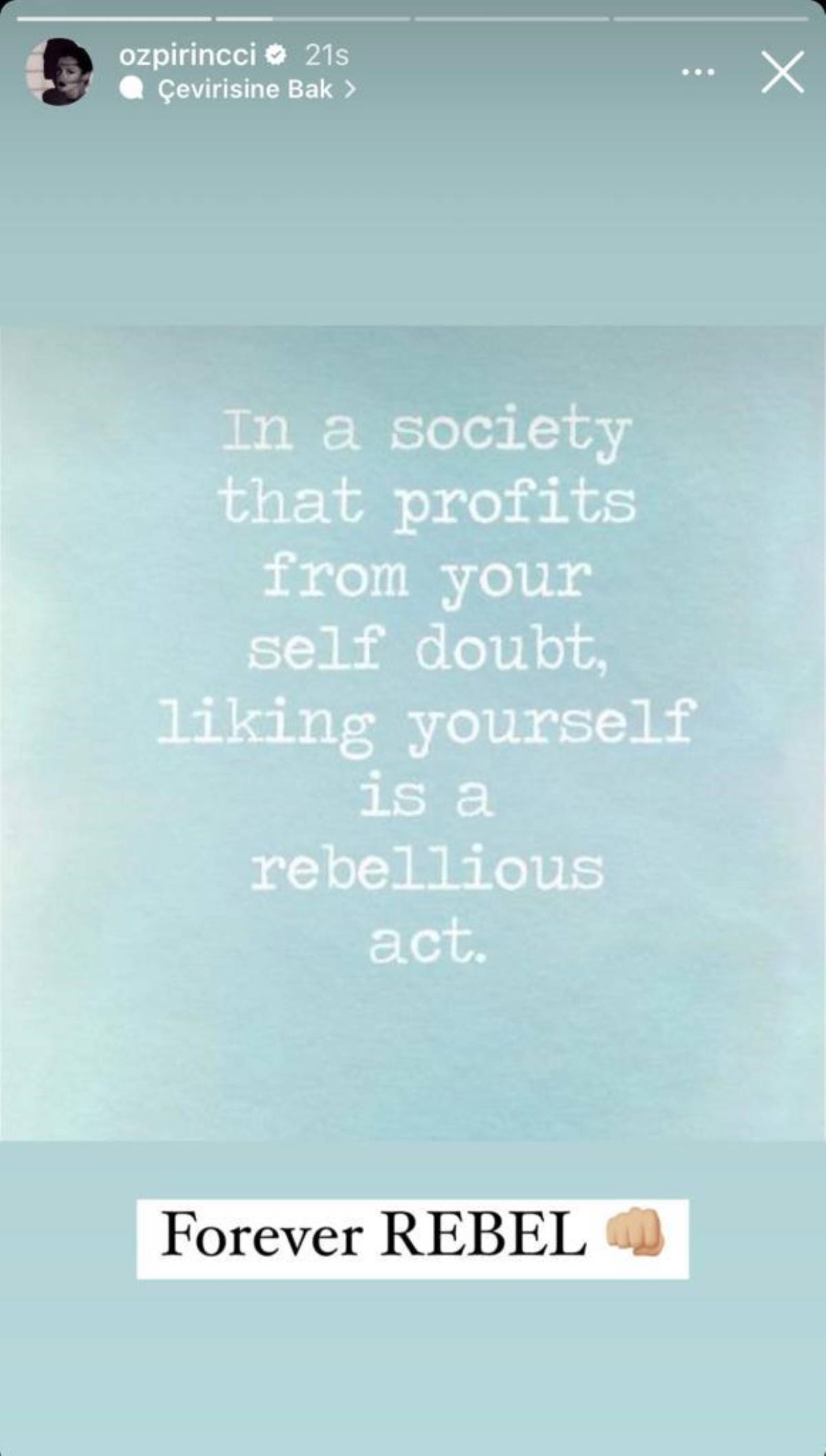 "Kendinden şüphe duymandan çıkar sağlayan bir toplumda kendini beğenmek, sevmek isyankar bir davranıştır. Sonsuza kadar isyan."