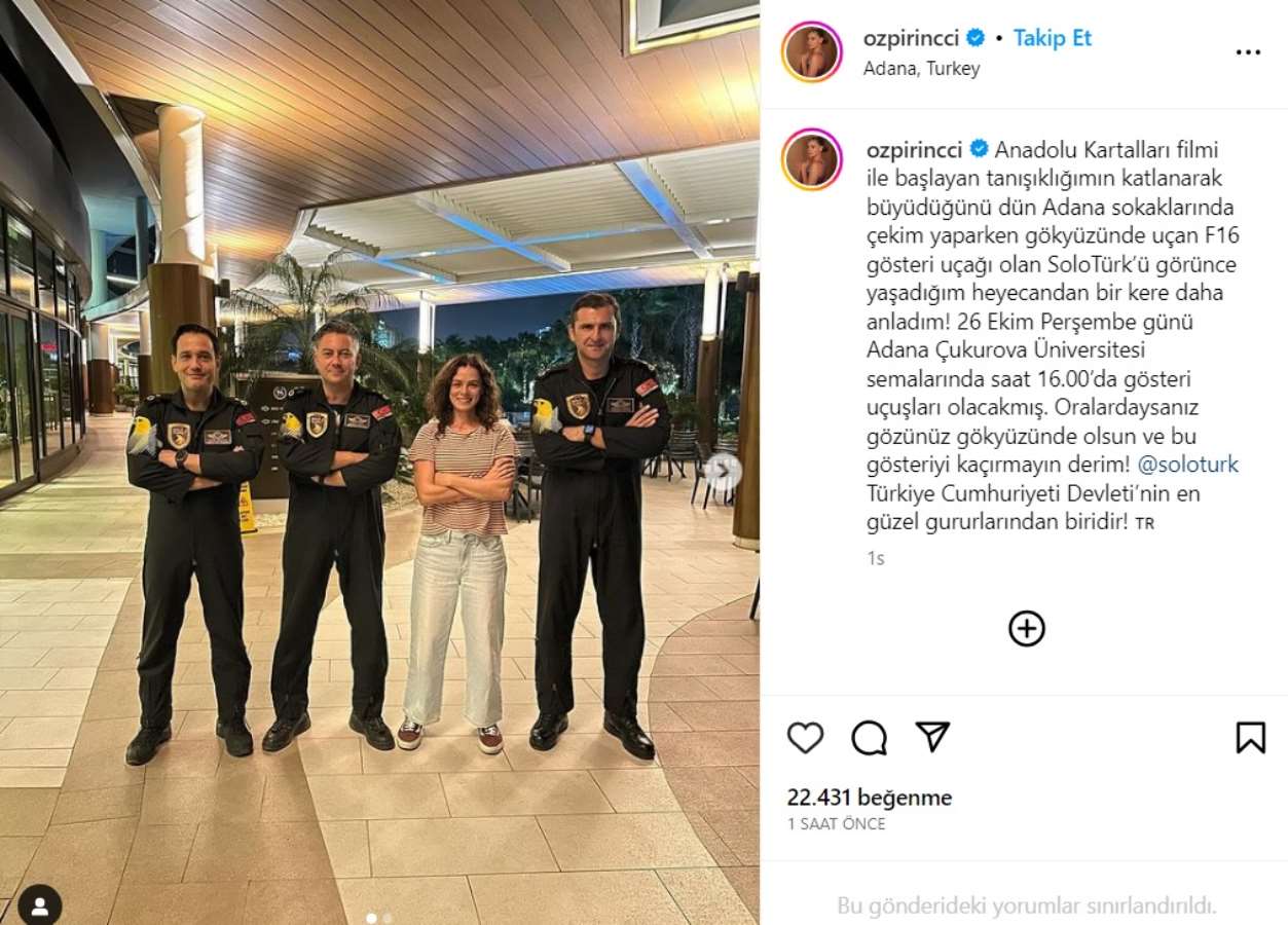 “Anadolu Kartalları filmi ile başlayan tanışıklığımın katlanarak büyüdüğünü dün Adana sokaklarında çekim yaparken gökyüzünde uçan F16 gösteri uçağı olan SoloTürk’ü görünce yaşadığım heyecandan bir kere daha anladım! 26 Ekim Perşembe günü Adana Çukurova Üniversitesi semalarında saat 16.00’da gösteri uçuşları olacakmış. Oralardaysanız gözünüz gökyüzünde olsun ve bu gösteriyi kaçırmayın derim! @soloturk Türkiye Cumhuriyeti Devleti’nin en güzel gururlarından biridir!”