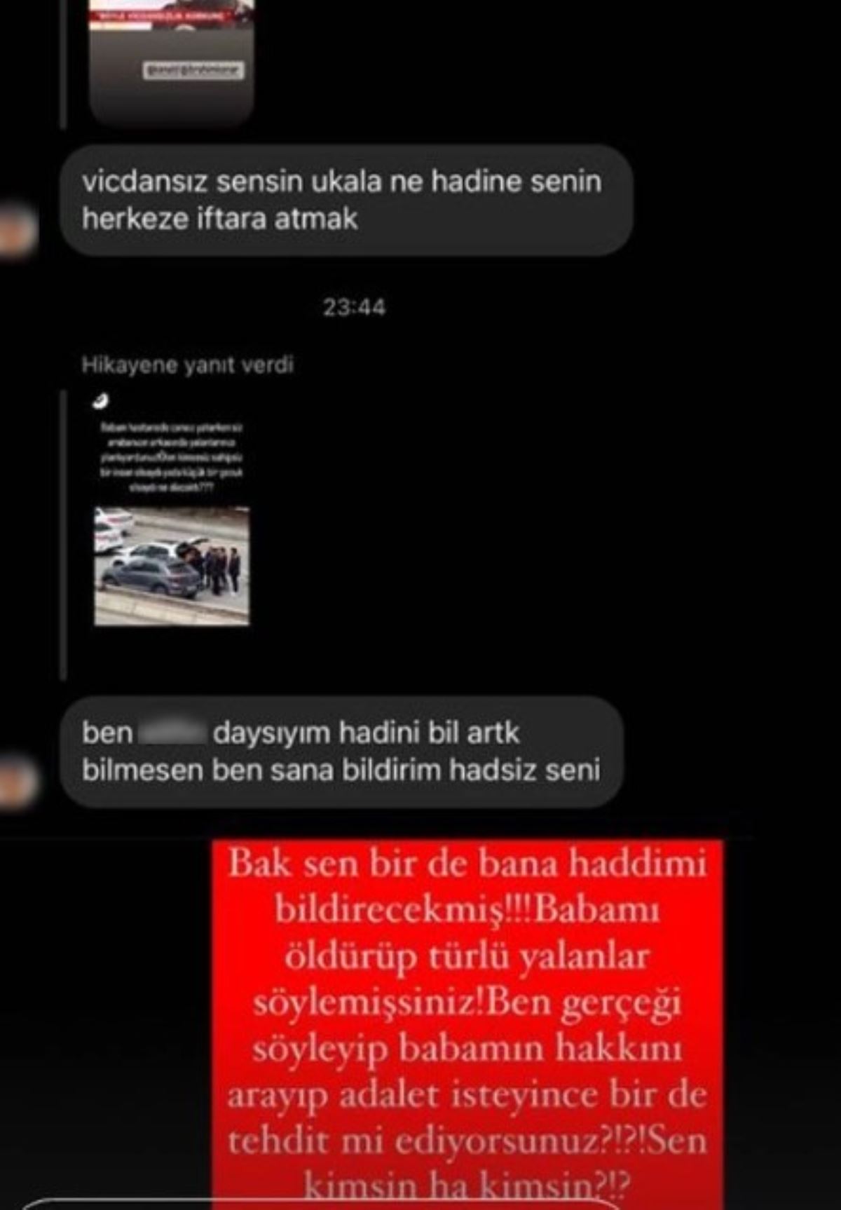 Ulusoy, yaptığı paylaşımda "“Ben babamın hakkını arayıp gerçeği söyleyip adalet isteyince bir de tehdit mi ediyorsunuz? Sen kimsin?” dedi.