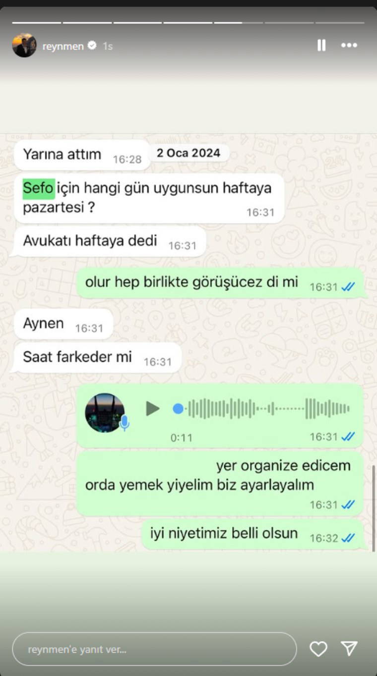 "Sonra sen star oldun Seyfullah. Etrafıma bana yazarsan seninle görüsecegimi söyledim. Asla bana yazmadın. Avukatın, avukatıma yazdı. Görüselim dedim. Hatta yeri ben organize edeyim iyi niyetimiz belli olsun dedim. 2 Ocak 2024. 3 Ocakta avukatın senin bana duygusal olarak kırgın olduğundan bahsederek teklifimizi reddetti. Bundan bir sene önce. Amacının bişeyleri çözmek ya da talep etmek olmadığı aşikar. Niyetin beni hitap ettiğin topluluğun karşısında küçük düşürmek. Normalde bu açıklamayı yapmazdım ama sen söylediğinin aksine maaleaef artniyetlisin. Sonra senin hypen düştü tabi çok normal ben defalarca yaşadığım için bu durumu anlayabiliyorum. İbo araya girerek bizi barıştırmak istedi. İstemedim çünkü defalarca etrafıma bana yazman gerektiğini söylemiştim. Ben hariç herkese yazdın. Ben haric herkese ağladın ama maalesef bir tek bana yazmadın Seyfullah. Senin adına çok üzülüyorum. Eski Sefo değilsin artık ve insanlarda kaldığını düşündüğün paraların peşine koşturmaya başladın."