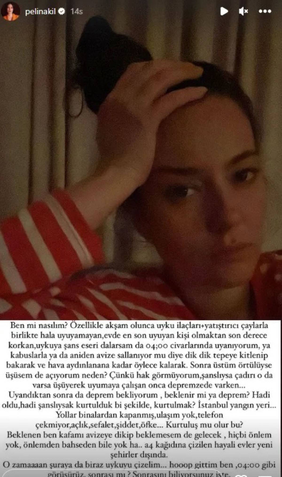 Son olarak ATV'de izleyicilerle buluşan "Eşkıya Dünyaya Hükümdar Olmaz" adlı televizyon dizisinde Bahar karakterini canlandıran oyuncu Pelin Akil Altan, sosyal medya hesabından yaptığı paylaşımda depremzedelerin yaşadığı barınma sorunlarına değindi ve deprem korkusu nedeniyle uyuyamadığını söyledi.