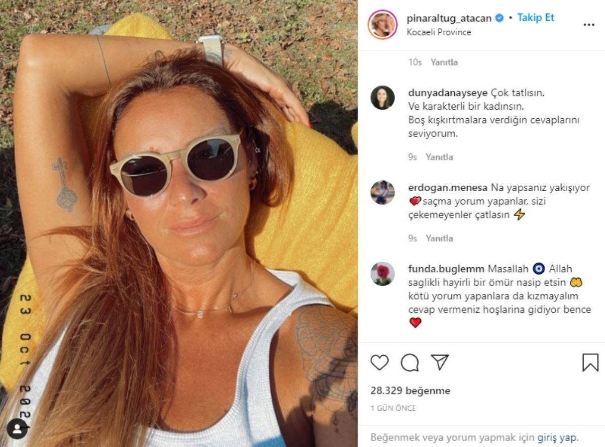 Pınar Altuğ'a bir takipçisi, "Ben olsam bu dövmeleri sildiririm. Neden kendinizi damgaladınız? Doğum lekesi büyük ve siyah olursa sevilmez ama siz kendiniz leke yapmışsınız derinize..." yorumunu yaptı.