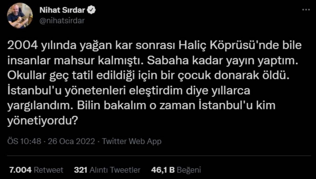 Tartışmalar sürerken; ünlü radyo programcısı Nihat Sırdar’dan gündemdeki konuya ilişkin bir paylaşım geldi. Twitter’dan yaptığı paylaşımla 2004 kışını hatırlatan Sırdar, “Haliç Köprüsü'nde bile insanlar mahsur kalmıştı. Okullar geç tatil edildiği için bir çocuk donarak öldü” sözlerini kullandı. “İstanbul'u yönetenleri eleştirdim diye yıllarca yargılandım” diyen ünlü radyocu, “Bilin bakalım o zaman İstanbul'u kim yönetiyordu?” diye sordu.