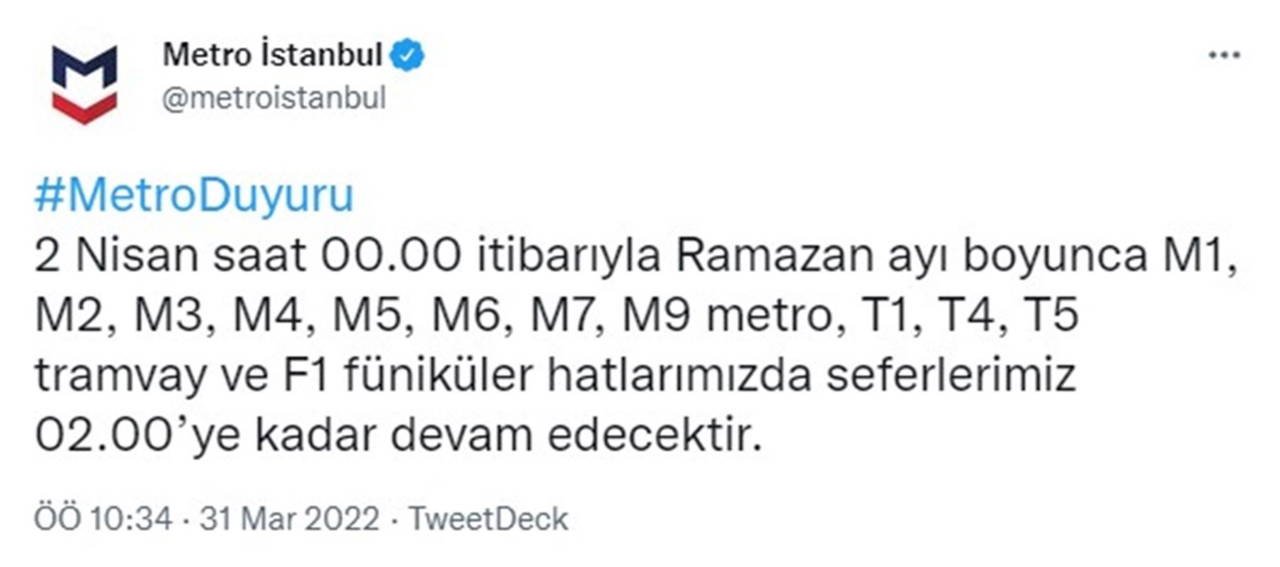 "2 Nisan saat 00.00 itibarıyla Ramazan ayı boyunca M1, M2, M3, M4, M5, M6, M7, M9 metro, T1, T4, T5 tramvay ve F1 füniküler hatlarımızda seferlerimiz 02.00'ye kadar devam edecektir."