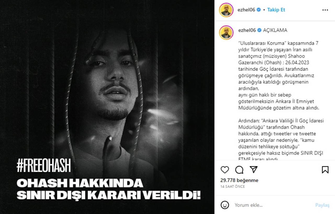Türkiye'de yaşayan İran asıllı rap sanatçısı Shahoo 'Ohash' Gazeranchi hakkında, attığı birkaç tweet gerekçe gösterilerek sınır dışı etme kararı alındığı açıklandı.
