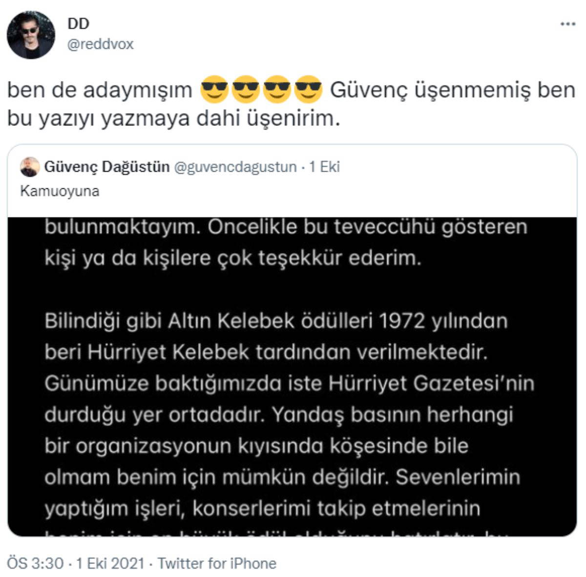 "Dağüstün’ün ‘çekilme’ açıklamasını paylaşarak, "Ben de adaymışım Güvenç üşenmemiş ben bu yazıyı yazmaya dahi üşenirim"