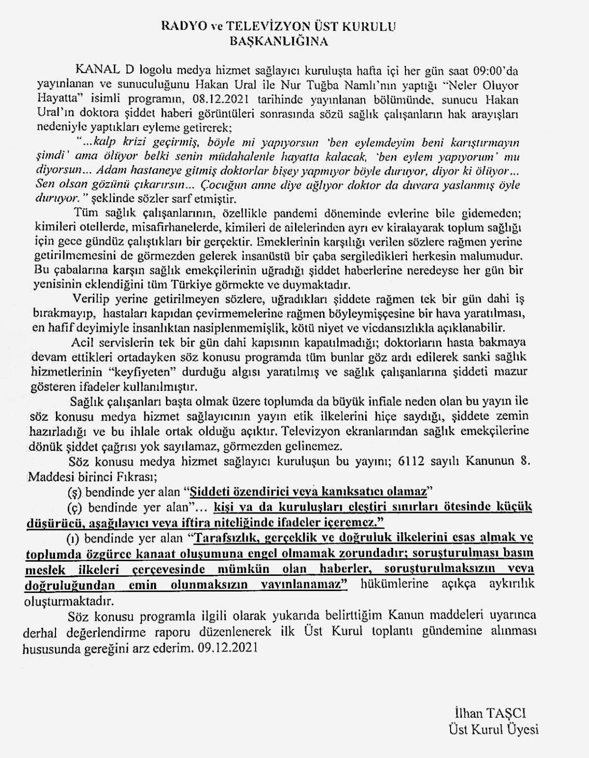 Taşçı verdiği dilekçede, "Sağlık çalışanları başta olmak üzere toplumda da büyük infiale neden olan bu yayın ile söz konusu medya hizmet sağlayıcının yayın etik ilkelerini hiçe saydığı, şiddele zemin hazırladığı ve bu ihlale ortak olduğu açıktır. Televizyon ekranlarından sağlık emekçilerine dönük şiddet çağrısı yok sayılamaz, görmezden gelinemez" ifadelerini kullandı.
