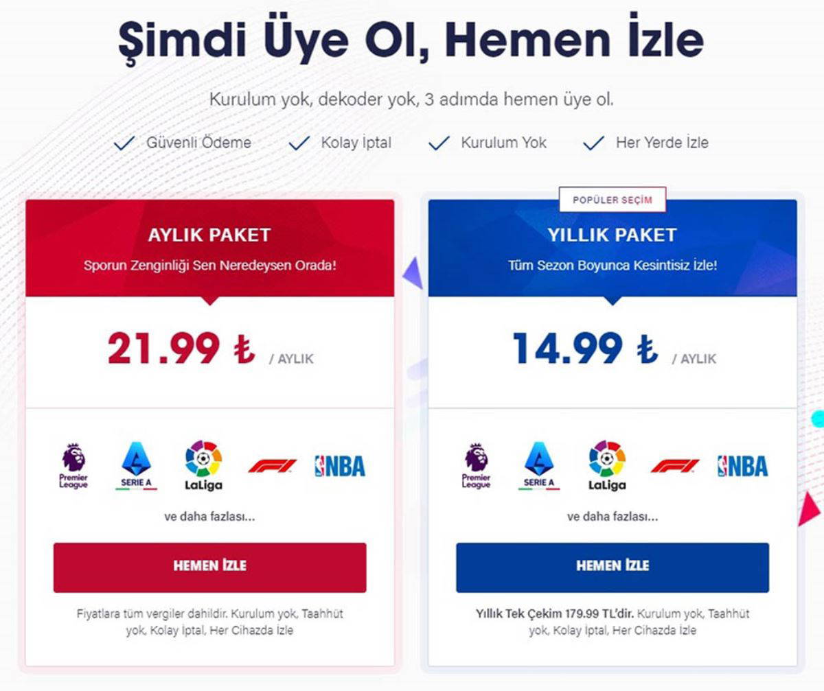 S Sport Plus platformunun 1 yıllık üyeliği 180 TL, aylık üyeliği ise 22 TL olarak belirlenmiş durumda. Üyelik işlemleri sırasında herhangi bir taahhüt istenmediğini de belirtelim.