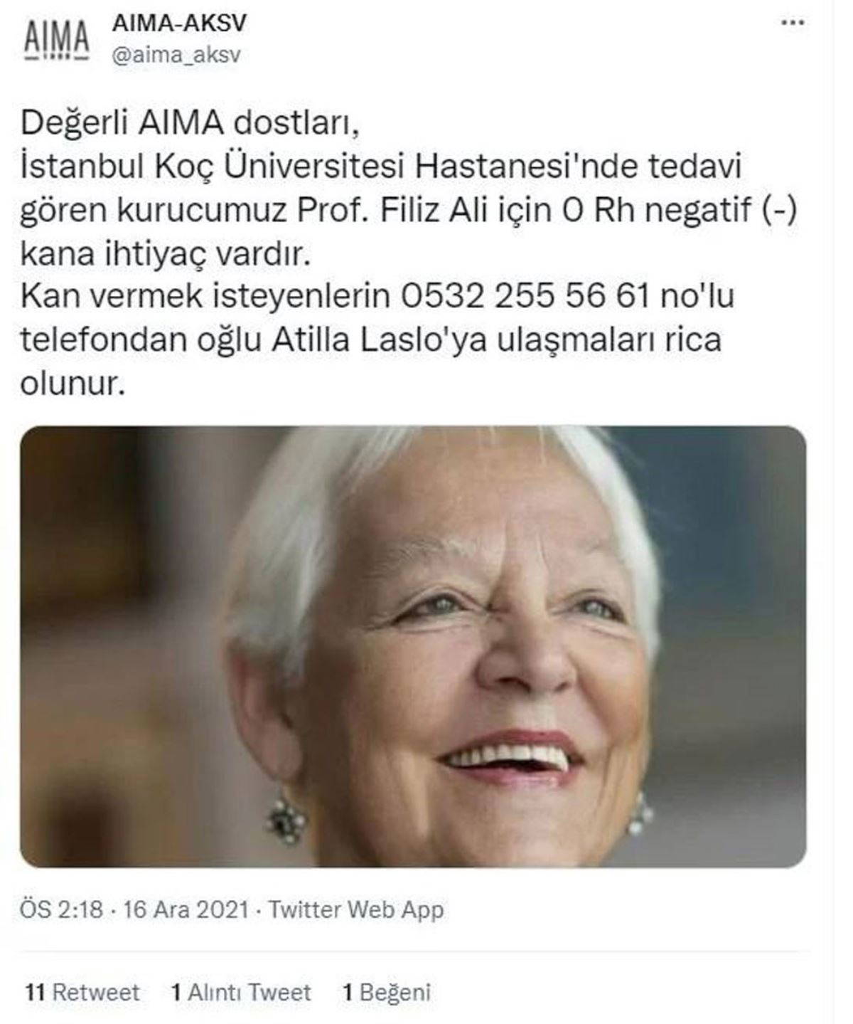 “Değerli AIMA dostları, İstanbul Koç Üniversitesi Hastanesi’nde tedavi gören kurucumuz Prof. Filiz Ali için 0 Rh negatif (-) kana ihtiyaç vardır. Kan vermek isteyenlerin 0532 255 56 61 no’lu telefondan oğlu Atilla Laslo’ya ulaşmaları rica olunur.”