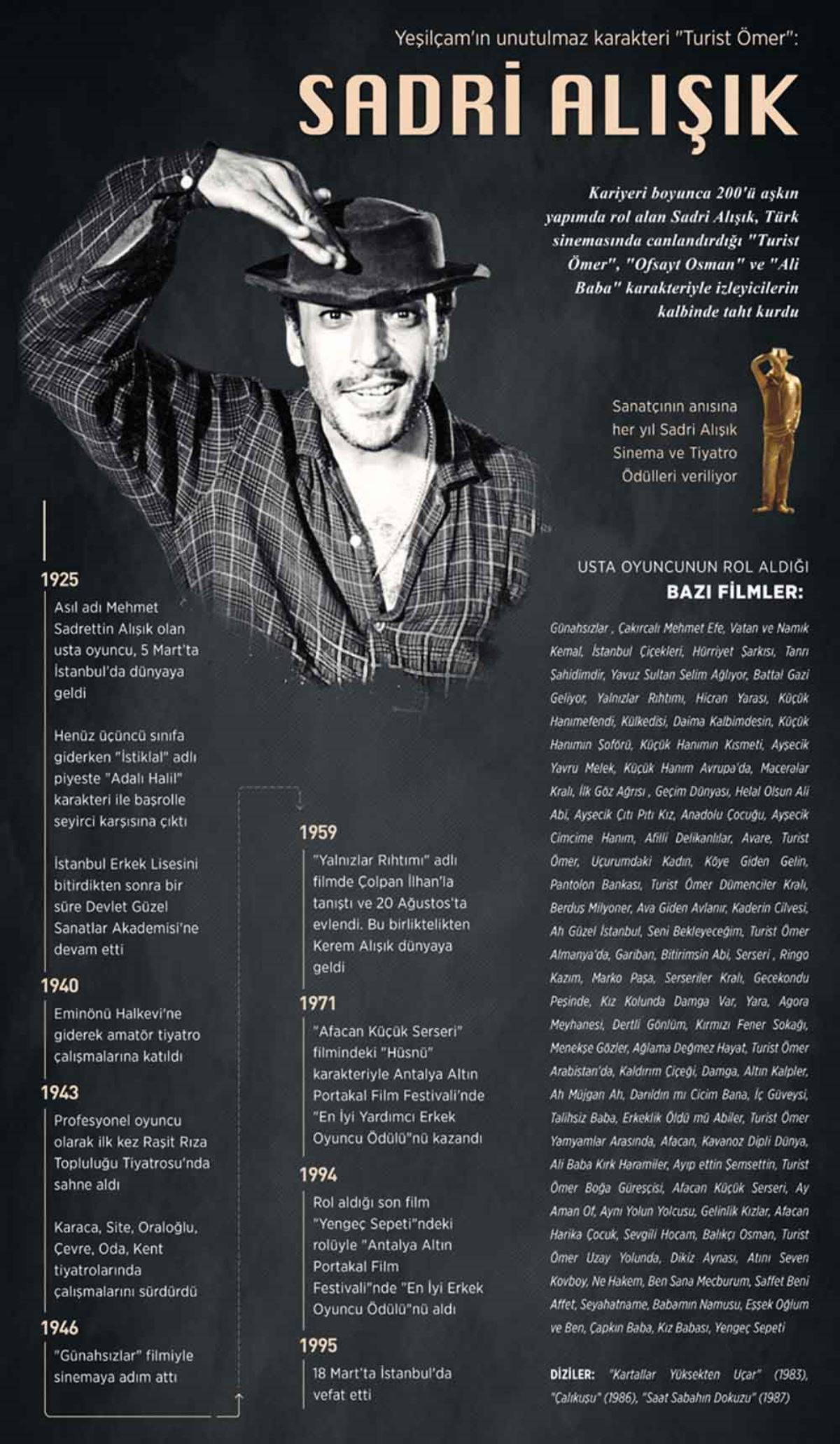 Dram rolleriyle başladığı oyunculuk kariyerini, oynadığı komedi karakterleriyle zirveye taşıyan Sadri Alışık, 'Turist Ömer' karakteriyle hafızalarda yer edindi. 'Şaka ile Karışık', 'Fıstık Gibi Maşallah', 'Helal Olsun Ali Abi' ve 'Ah Güzel İstanbul' gibi birçok önemli filmde rol alan ünlü oyuncu, "Yalvarmaktansa kaybetmeyi tercih ederim. Prensip meselesi...", "Hayat demek, ölümü beklemek demektir. Az çok hepimiz denizi, yıldızları, ağaçları, işte falanları, filanları göreceğiz. Birçok şeyin tadına bakacağız sonra da ister istemez 'Gidiyorum Elveda' şarkısını söyleyeceğiz. Öyle ise gidenin de kalanın da gönlü hoş olsun", "Şu hayatın falanları filanları malum...", "Ama kabahat bende değil, şarkıdaki o kızda" gibi unutulmaz birçok repliğe de imza attı.
