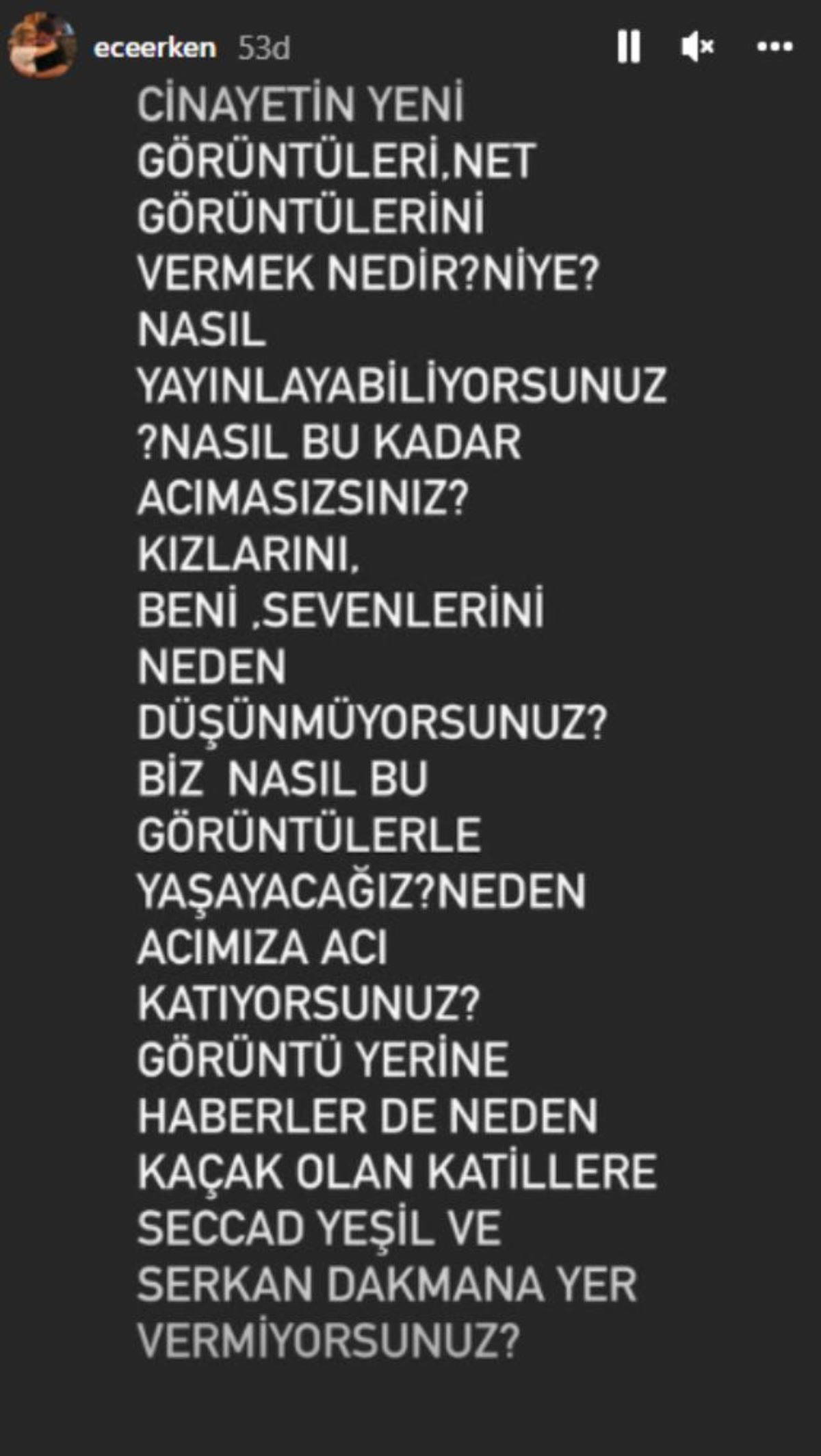 Erken, "Cinayetin yeni görüntüleri, net görüntülerini vermek nedir? Niye? Nasıl yayınlayabiliyorsunuz? Nasıl bu kadar acımasızsınız? Kızlarını, beni, sevenlerini neden düşünmüyorsunuz?" dedi.