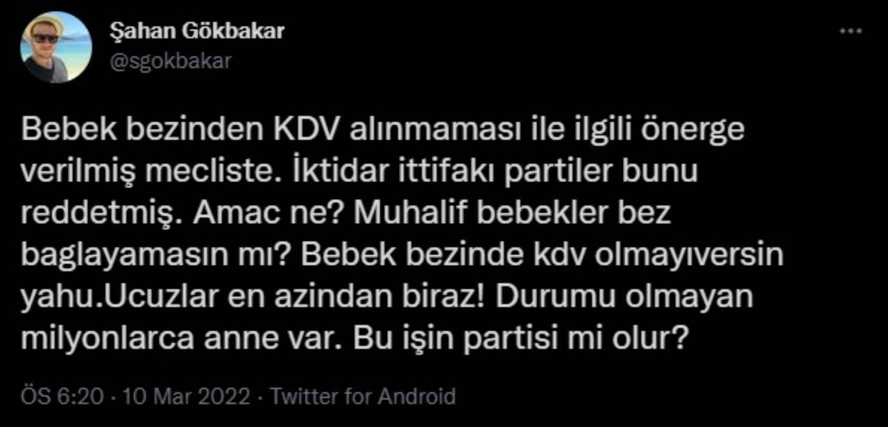 "Bebek bezinden KDV alınmaması ile ilgili önerge verilmiş Meclis'te. İktidar ittifakı partiler bunu reddetmiş. Amaç ne? Muhalif bebekler bez bağlayamasın mı? Bebek bezinde KDV olmayıversin yahu. Ucuzlar en azından biraz! Durumu olmayan milyonlarca anne var. Bu işin partisi mi olur?"