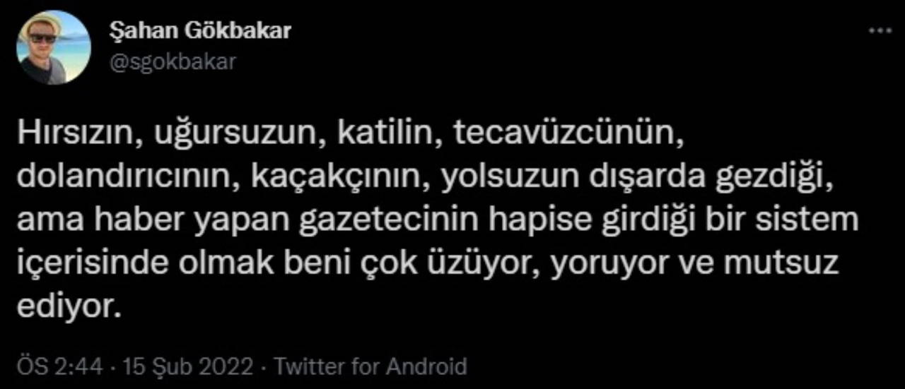 "Hırsızın, uğursuzun, katilin, tecavüzcünün, dolandırıcının, kaçakçının, yolsuzun dışarıda gezdiği ama haber yapan gazetecinin hapse girdiği bir sistem içerisinde olmak beni çok üzüyor, yoruyor ve mutsuz ediyor."