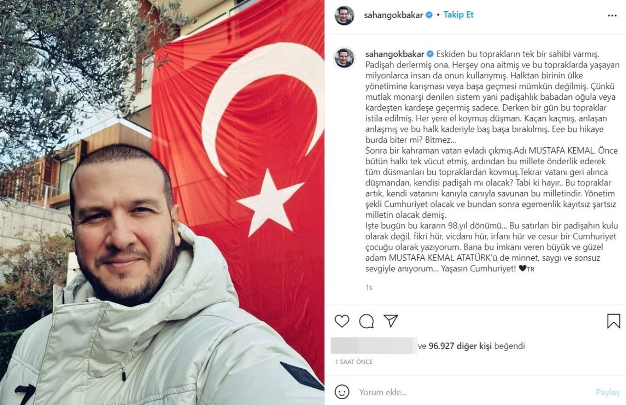 Sanat, spor ve siyaset camiasından da 29 Ekim Cumhuriyet Bayramı'na yönelik paylaşımlar geldi. Bu isimlerden biri de ünlü komedyen Şahan Gökbakar oldu.