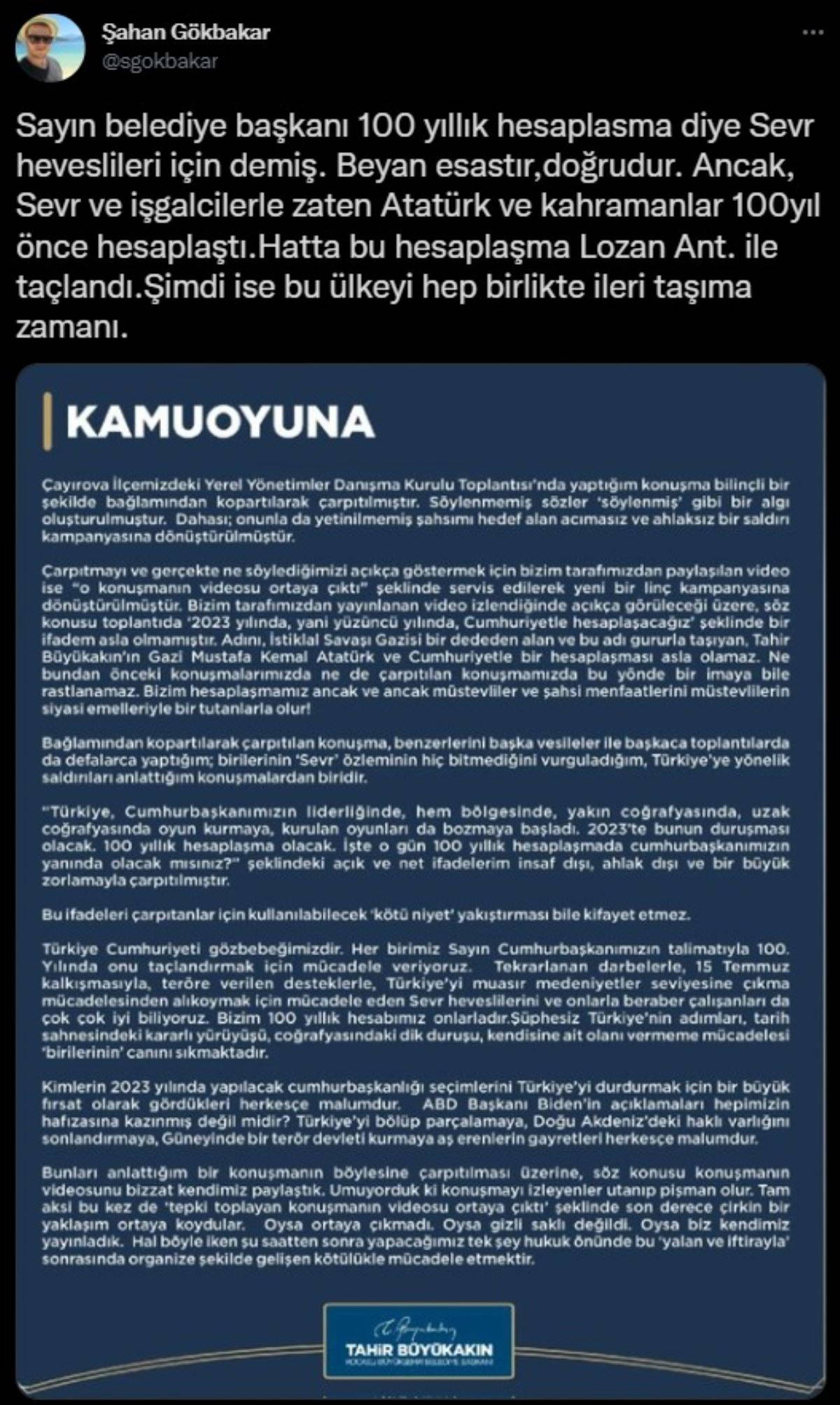 "Sayın belediye başkanı 100 yıllık hesaplaşma diye Sevr heveslileri için demiş. Beyan esastır, doğrudur. Ancak, Sevr ve işgalcilerle zaten Atatürk ve kahramanlar 100 yıl önce hesaplaştı. Hatta bu hesaplaşma Lozan Antlaşması ile taçlandı. Şimdi ise bu ülkeyi hep birlikte ileri taşıma zamanı."