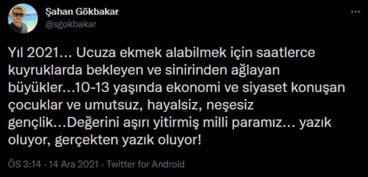"Yıl 2021... Ucuza ekmek alabilmek için saatlerce kuyruklarda bekleyen ve sinirinden ağlayan büyükler...10-13 yaşında ekonomi ve siyaset konuşan çocuklar ve umutsuz, hayalsiz, neşesiz gençlik...Değerini aşırı yitirmiş milli paramız... yazık oluyor, gerçekten yazık oluyor!"