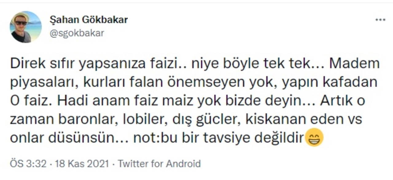 “Direk sıfır yapsanıza faizi… Niye böyle tek tek… Madem piyasaları, kurları falan önemseyen yok, yapın kafadan 0 faiz. Hadi anam faiz maiz yok bizde deyin… Artık o zaman baronlar, lobiler, dış güçler, kıskanan eden vs. onlar düşünsün…”