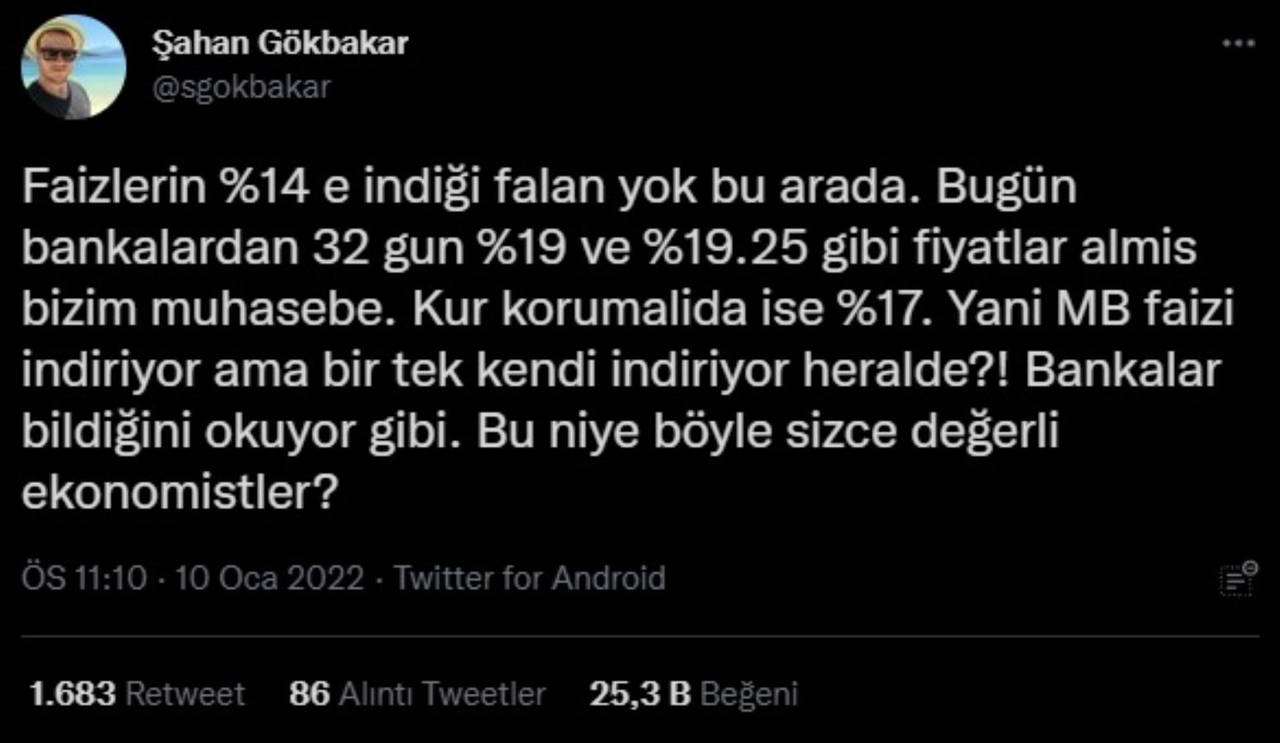"Faizlerin yüzde 14 e indiği falan yok bu arada. Bugün bankalardan 32 gün yüzde 19 ve yüzde 19.25 gibi fiyatlar almış bizim muhasebe. Kur korumalıda ise yüzde 17. Yani MB faizi indiriyor ama bir tek kendi indiriyor herhalde? Bankalar bildiğini okuyor gibi. Bu niye böyle sizce değerli ekonomistler?"