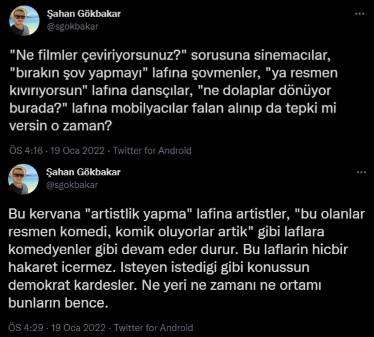 "Bu kervana 'artistlik yapma' lafına artistler, "bu olanlar resmen komedi, komik oluyorlar artık" gibi laflara komedyenler gibi devam eder durur. Bu lafların hiçbiri hakaret içermez. İsteyen istediği gibi konuşsun demokrat kardeşler. Ne yeri, ne zamanı, ne ortamı bunların bence."