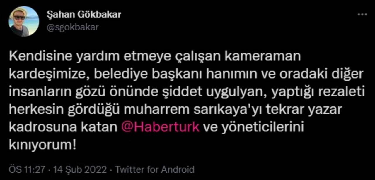 "Kendisine yardım etmeye çalışan kameraman kardeşimize, belediye başkanı hanımın ve oradaki diğer insanların gözü önünde şiddet uygulyan, yaptığı rezaleti herkesin gördüğü Muharrem Sarıkaya'yı tekrar yazar kadrosuna katan Habertürk ve yöneticilerini kınıyorum!"