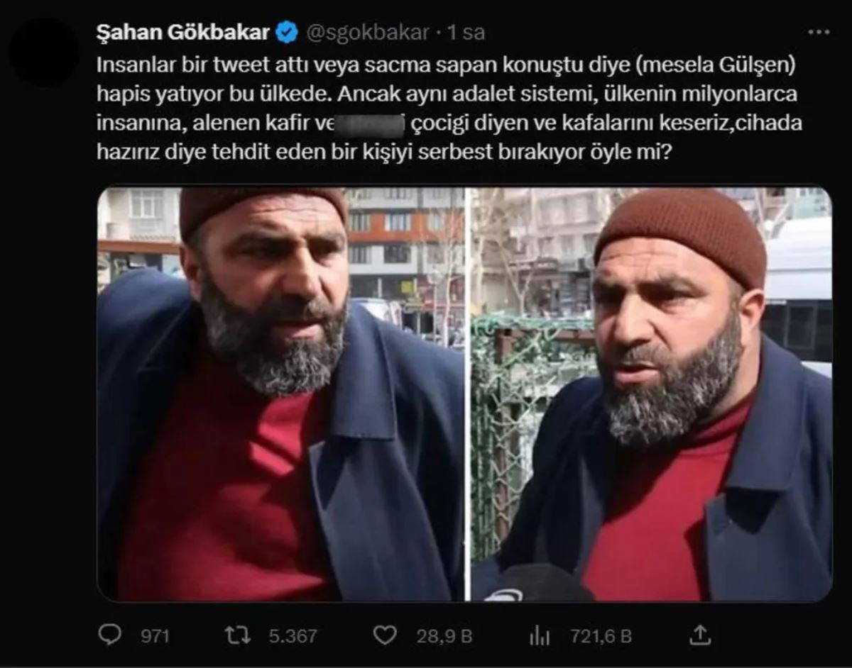 Ünlü şarkıcı Gülşen'in bir konserinde orkestrası ile konuşurken yaptığı 'İmam hatip esprisi' nedeniyle tutuklanarak hapse gönderilmesini hatırlatan ünlü komedyen ve oyuncu Şahan Gökbakar, 'kafa kesme' tehdidinde bulunan kişnin serbest bırakılmasına tepki gösterdi.