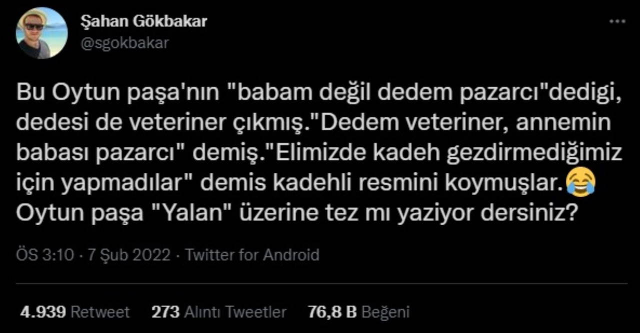"Bu Oytun Paşa'nın 'Babam değil dedem pazarcı' dediği dedesi de veteriner çıkmış. 'Dedem veteriner, annemin babası pazarcı' demiş.'Elimizde kadeh gezdirmediğimiz için yapmadılar' demiş kadehli resmini koymuşlar. Oytun Paşa 'Yalan' üzerine tez mi yazıyor dersiniz?"