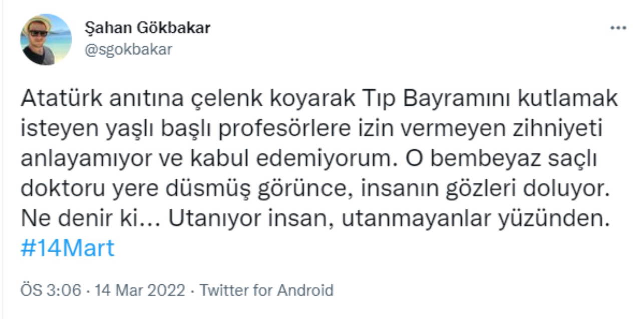 Gökbakar, ''Atatürk anıtına çelenk koyarak Tıp Bayramını kutlamak isteyen yaşlı başlı profesörlere izin vermeyen zihniyeti anlayamıyor ve kabul edemiyorum. O bembeyaz saçlı doktoru yere düsmüş görünce, insanın gözleri doluyor. Ne denir ki... Utanıyor insan, utanmayanlar yüzünden'' diye yazdı.