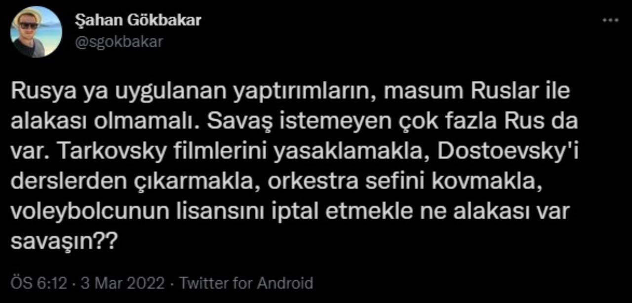 "Rusya'ya uygulanan yaptırımların, masum Ruslar ile alakası olmamalı. Savaş istemeyen çok fazla Rus da var. Tarkovski filmlerini yasaklamakla, Dostoyevski'yi derslerden çıkarmakla, orkestra şefini kovmakla, voleybolcunun lisansını iptal etmekle ne alakası var savaşın??"